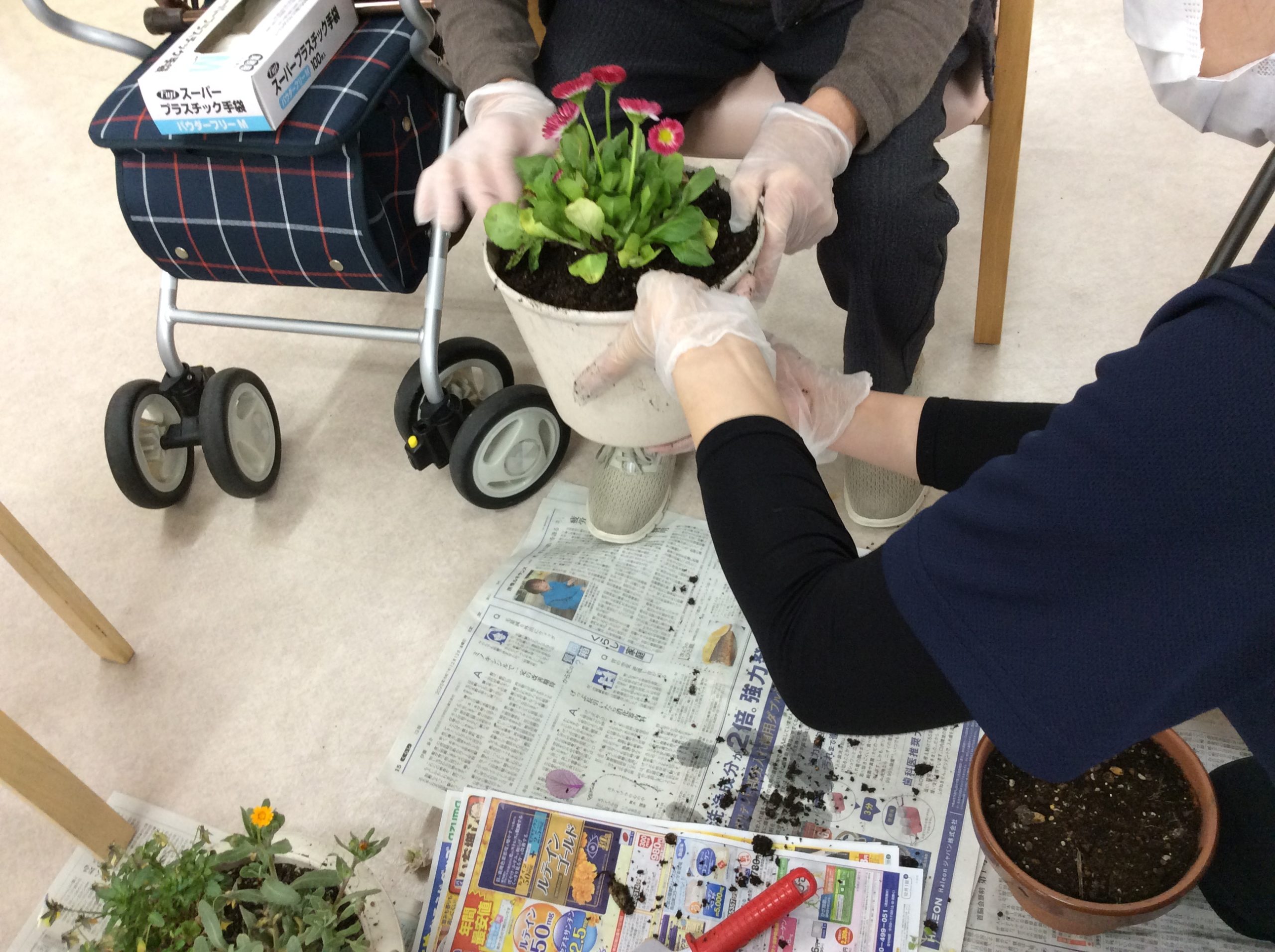 先日デイケアで春の花の植え替えをしました!!