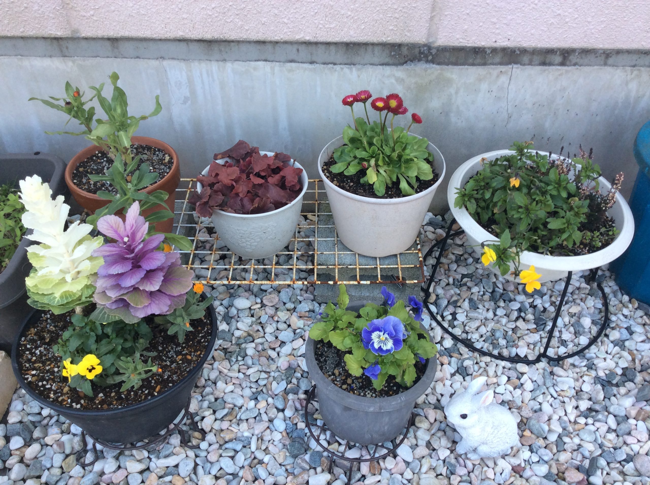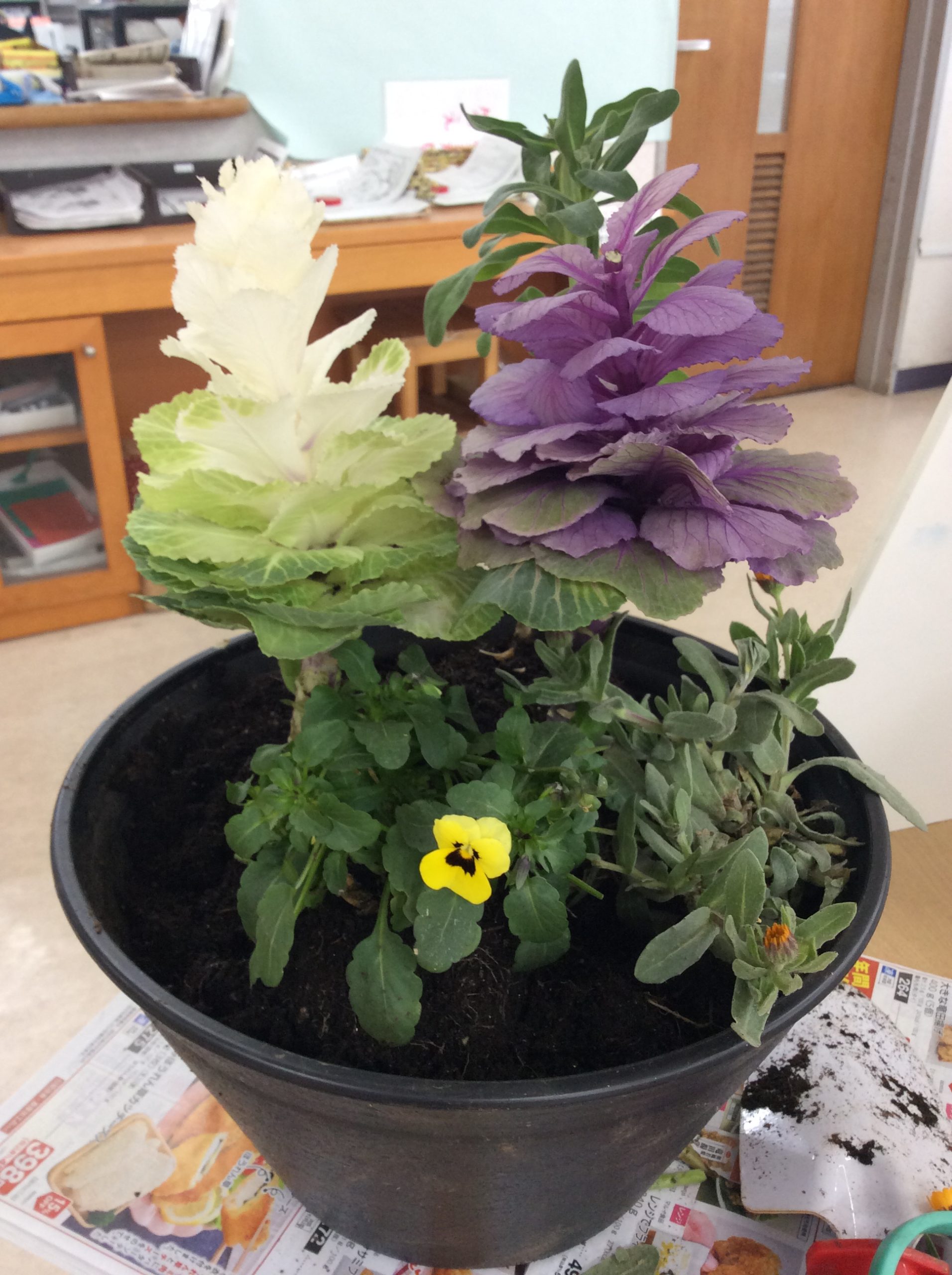 葉牡丹の鉢には黄色いパンジーと施設内に咲いていた”フユシラズ”を追加しました。