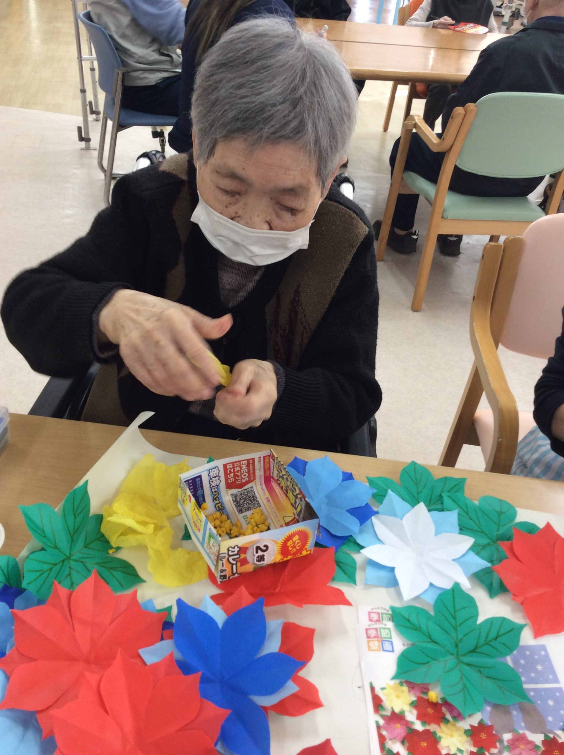 細やかな作業が得意なS様。お花紙を指先で丸めてポインセチアのつぼみ部分を作られました。