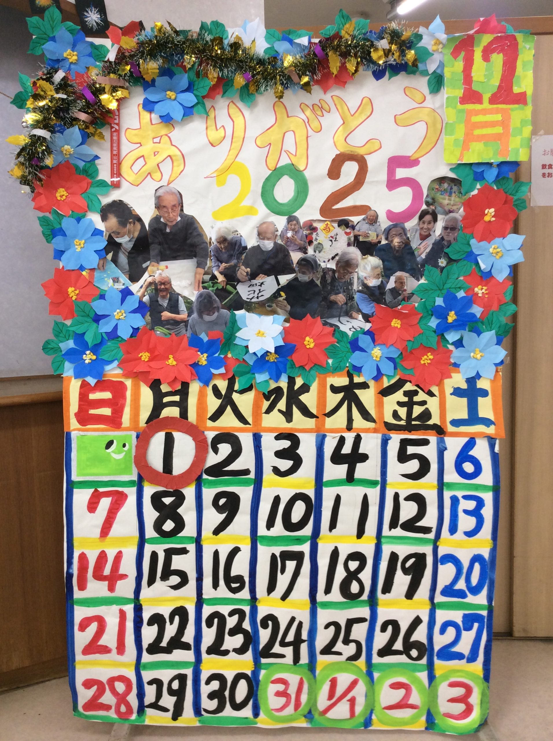 12月に入りました。今年も残すところ1ヶ月。デイケアでは今月も特大カレンダーを作りました。