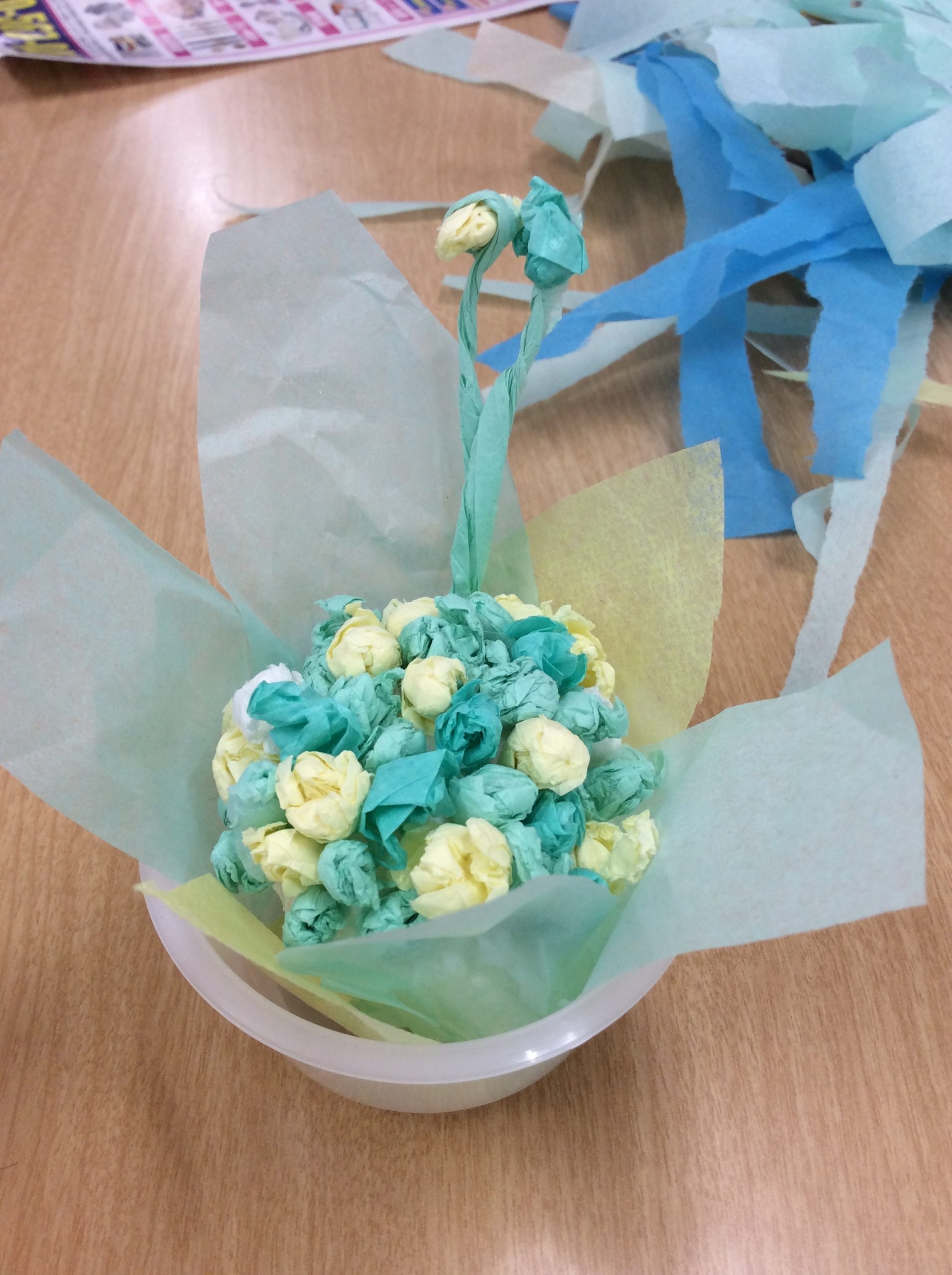 お花紙を小さく丸めた後、1個ずつ丁寧に貼り付けていくと・・・